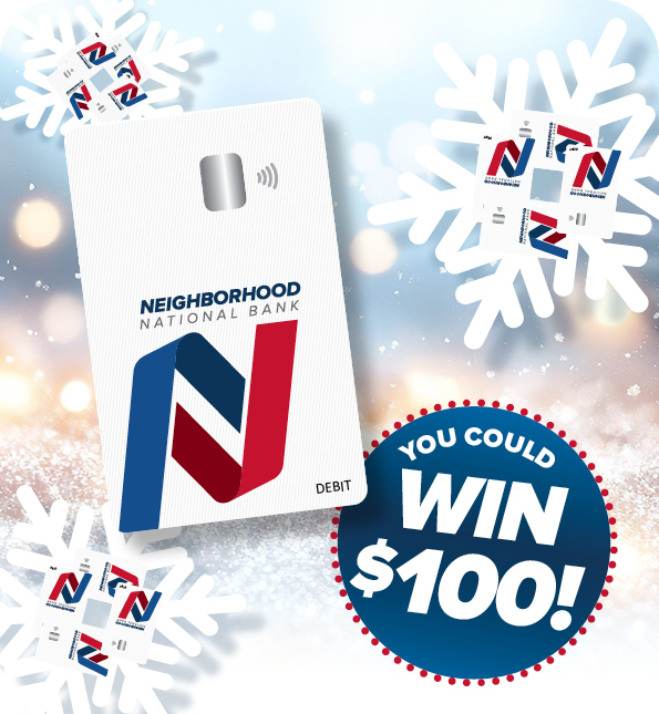 No purchase necessary to enter. You are automatically entered for the prize each time you use your Neighborhood National Bank Bank debit card for a point-of-sale purchase from November 1 - December 31, 2025. Each debit card transaction is an entry into the drawing for four (4) $100 winners. Business debit card transactions do not qualify. The drawing is subject to all federal, state and local laws and regulations. Employees, directors, officers, and their immediate families of Neighborhood National Bank Bank are not eligible. Must be a legal U.S. resident. There will be four $100 winners. Neighborhood National Bank’s decisions are final in all matters relating to this drawing. The odds of winning will depend upon the total number of debit card transactions by Neighborhood National Bank customers and entries received. The winner may receive an IRS Form 1099 from Neighborhood National Bank for the value of the prize. There is no charge for obtaining a Neighborhood National Bank debit card. If you wish to enter without making a debit transaction, please send a 3x5 card with your